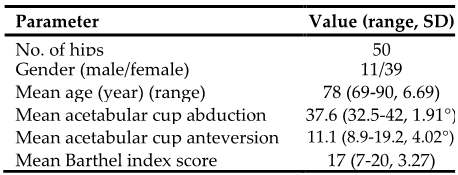 Results: Of the 50 patients who underwent THR, no dislocation was found after a follow-up period of at least 6 months. The mean acetabular cup abduction and anteversion angles were 37.6° (range 32.5°-42°, SD = 1.91°) and 11.1° (range 8.9°-19.2°, SD = 4.02°), respectively. Functional outcomes evaluated using the Barthel index at 6 months follow-up showed that 86% were excellent (mean 17 of 20) (range 7-20, SD = 3.27). A total of 87% of all patients returned to their pre-injury status. Five patients (10%) died after 6 months of follow-up, and all 5 died within 30 days after surgery. There were no cases of revision surgery at 6 months follow-up.