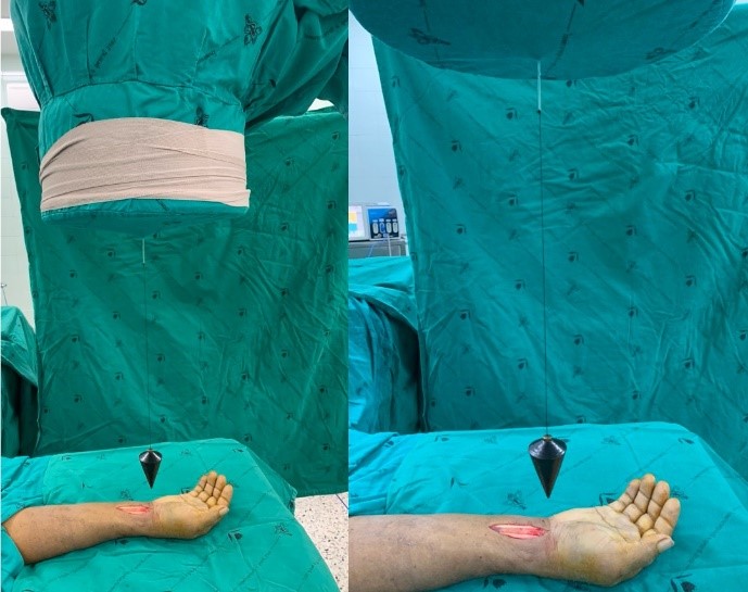 Purpose: Radiation exposure from intraoperative fluoroscopy is routinely encountered in orthopedic procedures, especially during distal radius fracture fixation. Prolonged exposure to high-dose radiation is a known risk factor for genetic mutations. This study presents a simple, alternative mechanical targeting device using a plummet that functions as a laser aimer.
